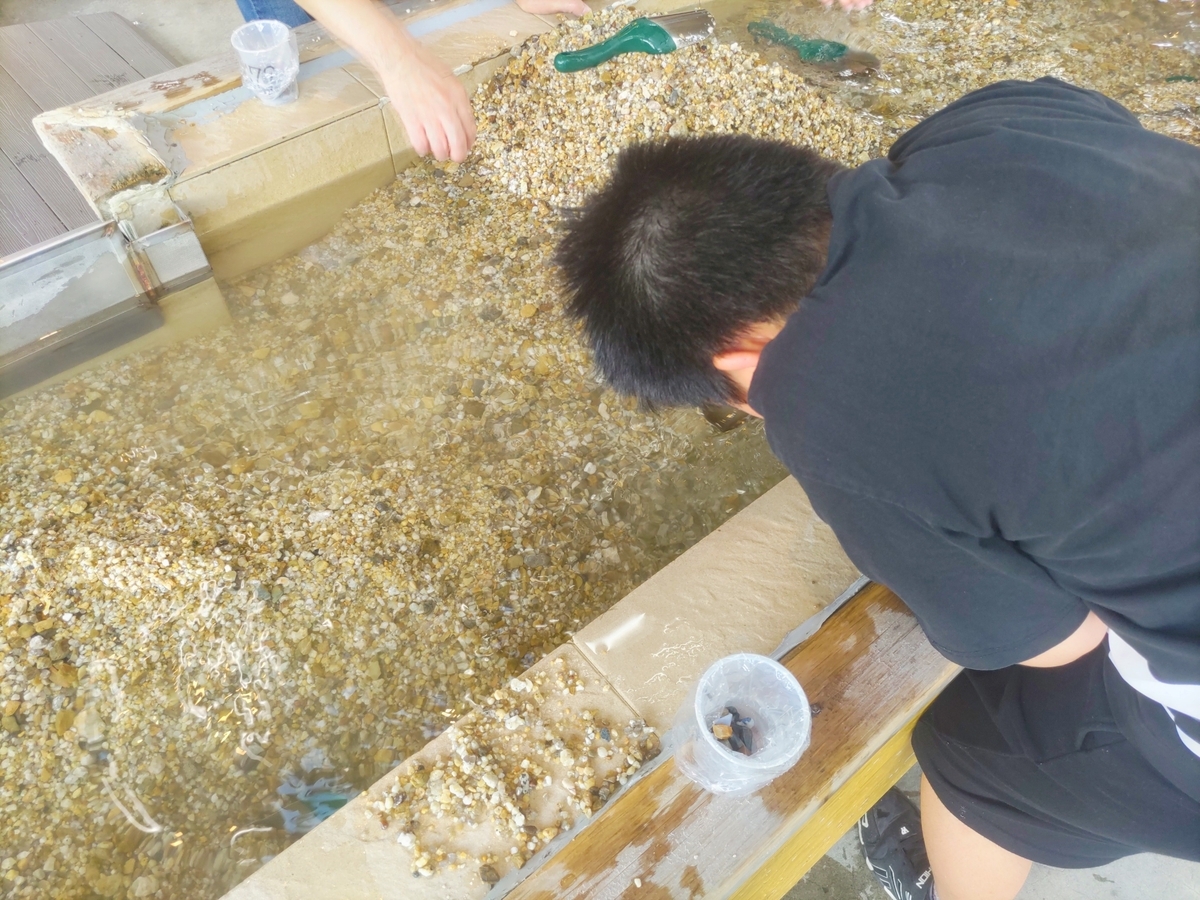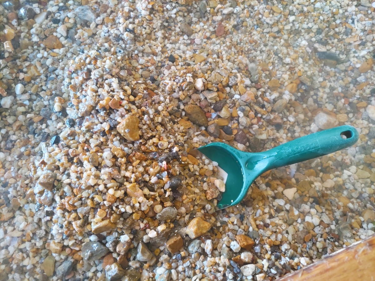 砂利の中に小さな天然石が、混ぜられていてスコップで掘りながら探し当てるという宝石探し体験